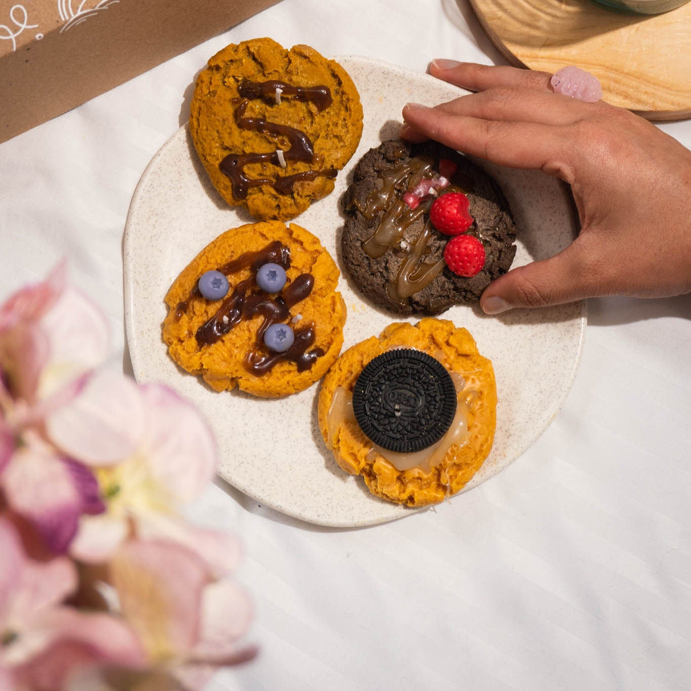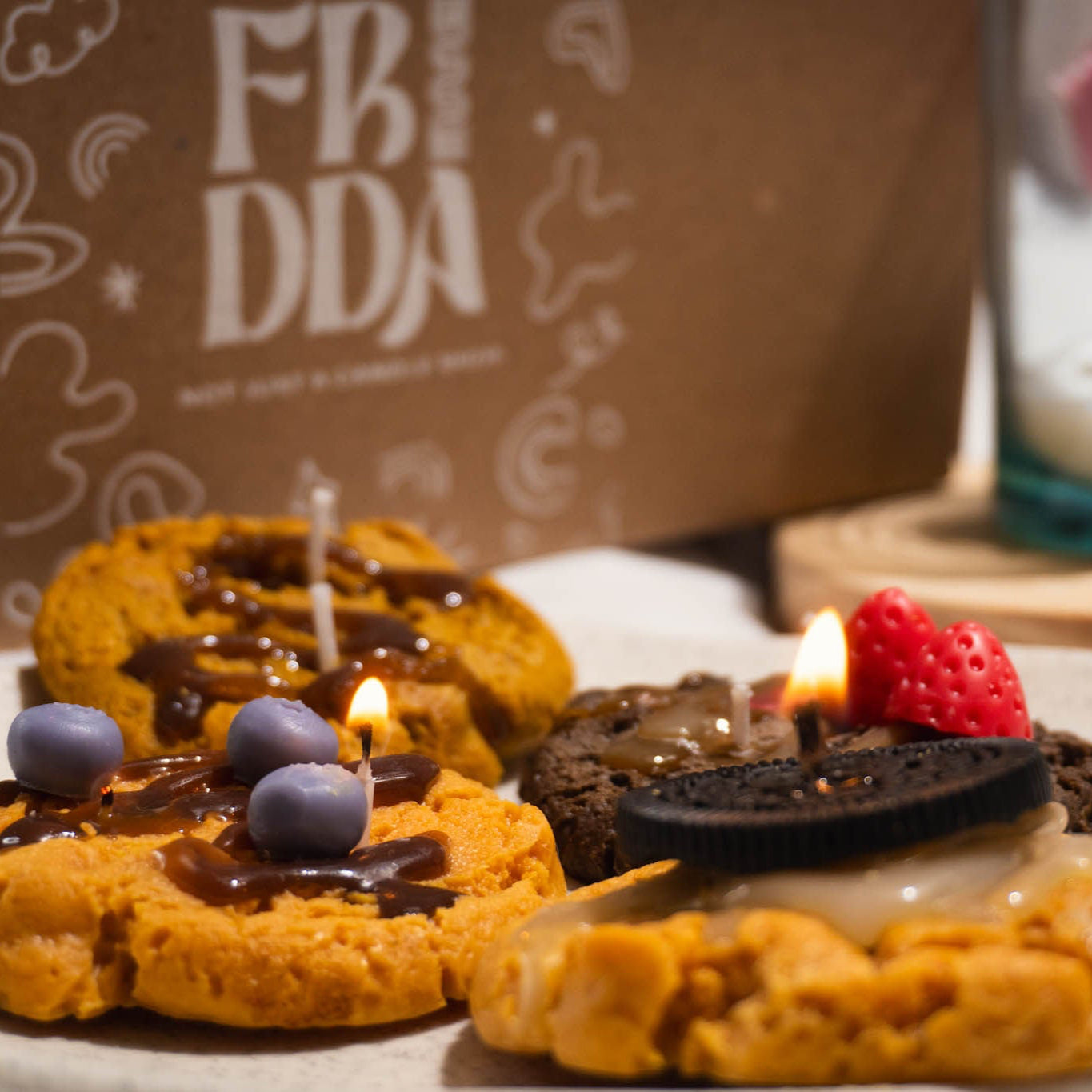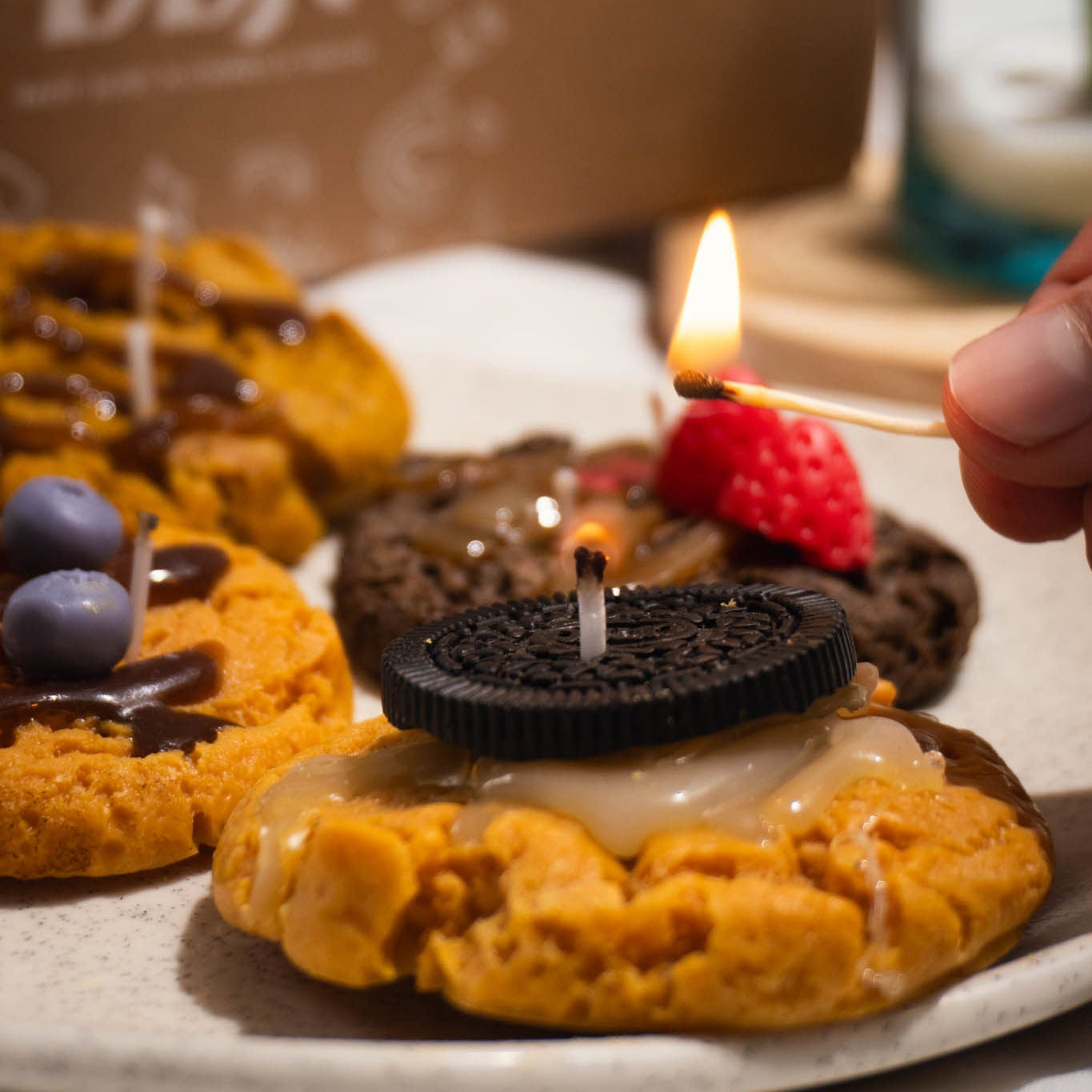 Un set de 4 velas en forma de galleta elaboradas con cera semi-vegetal y con un aroma acogedor a galleta recién horneada con toques de miel.
