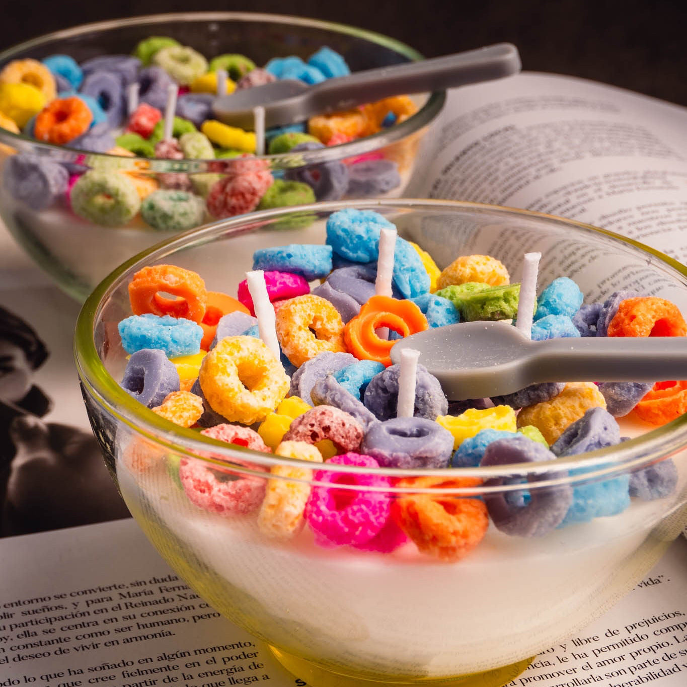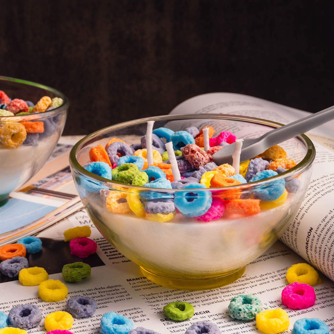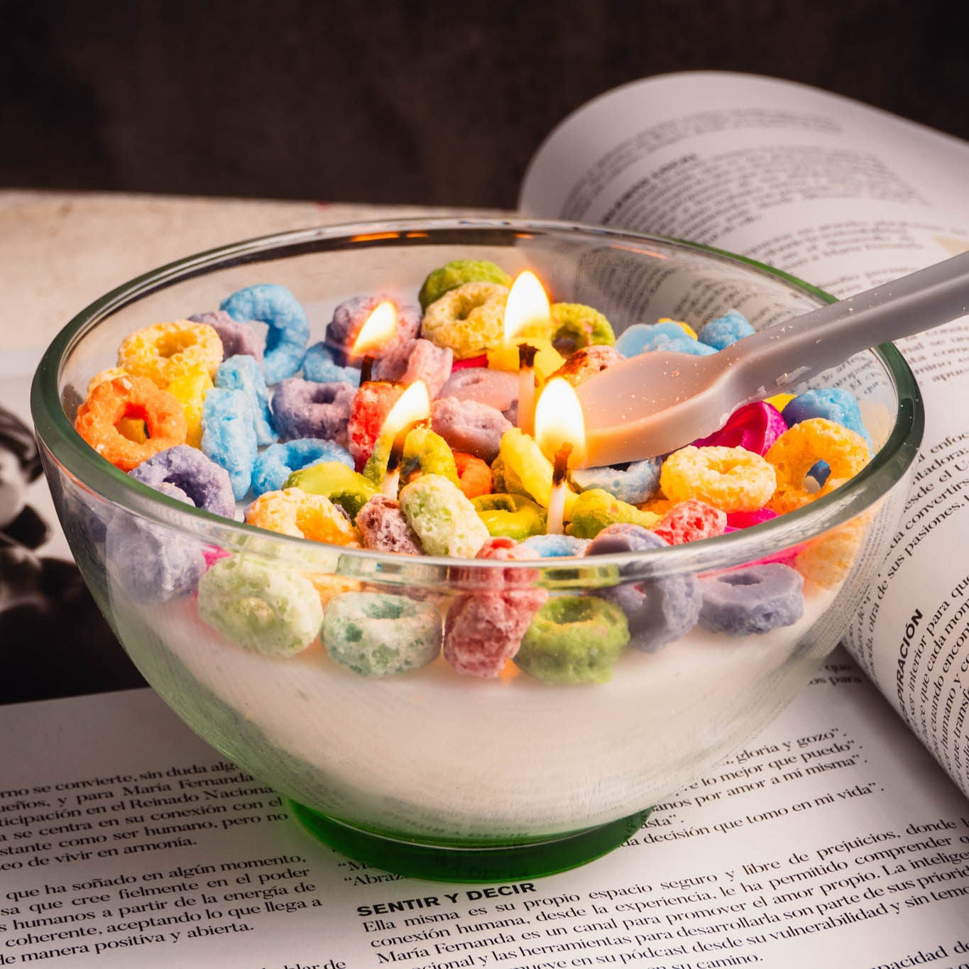 Frid Loops Candle es lo más cercano a una mañana perfecta en forma de vela. Con un bowl de vidrio y “cereales” coloridos en la parte superior, esta vela llenará tu hogar de dulzura y encanto.