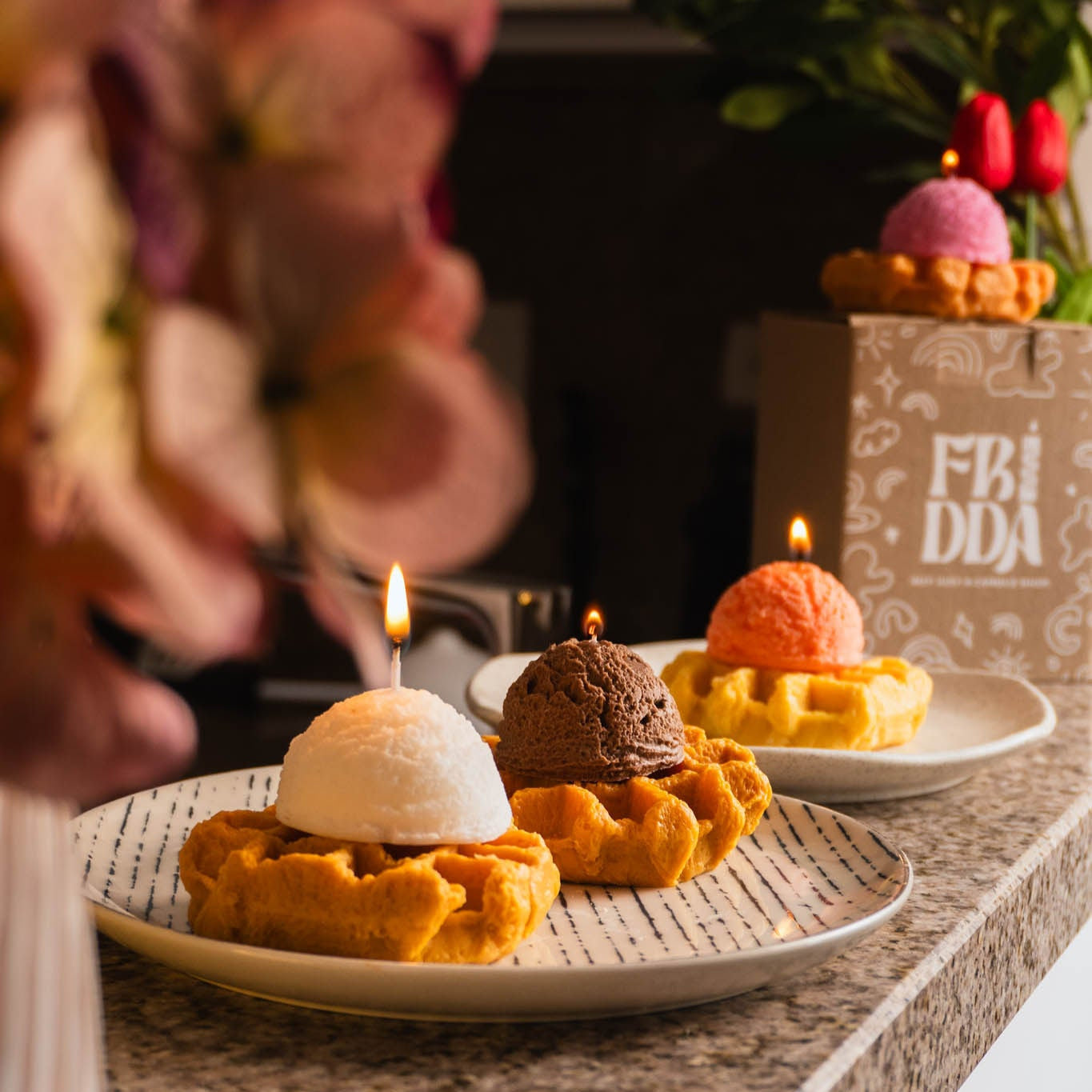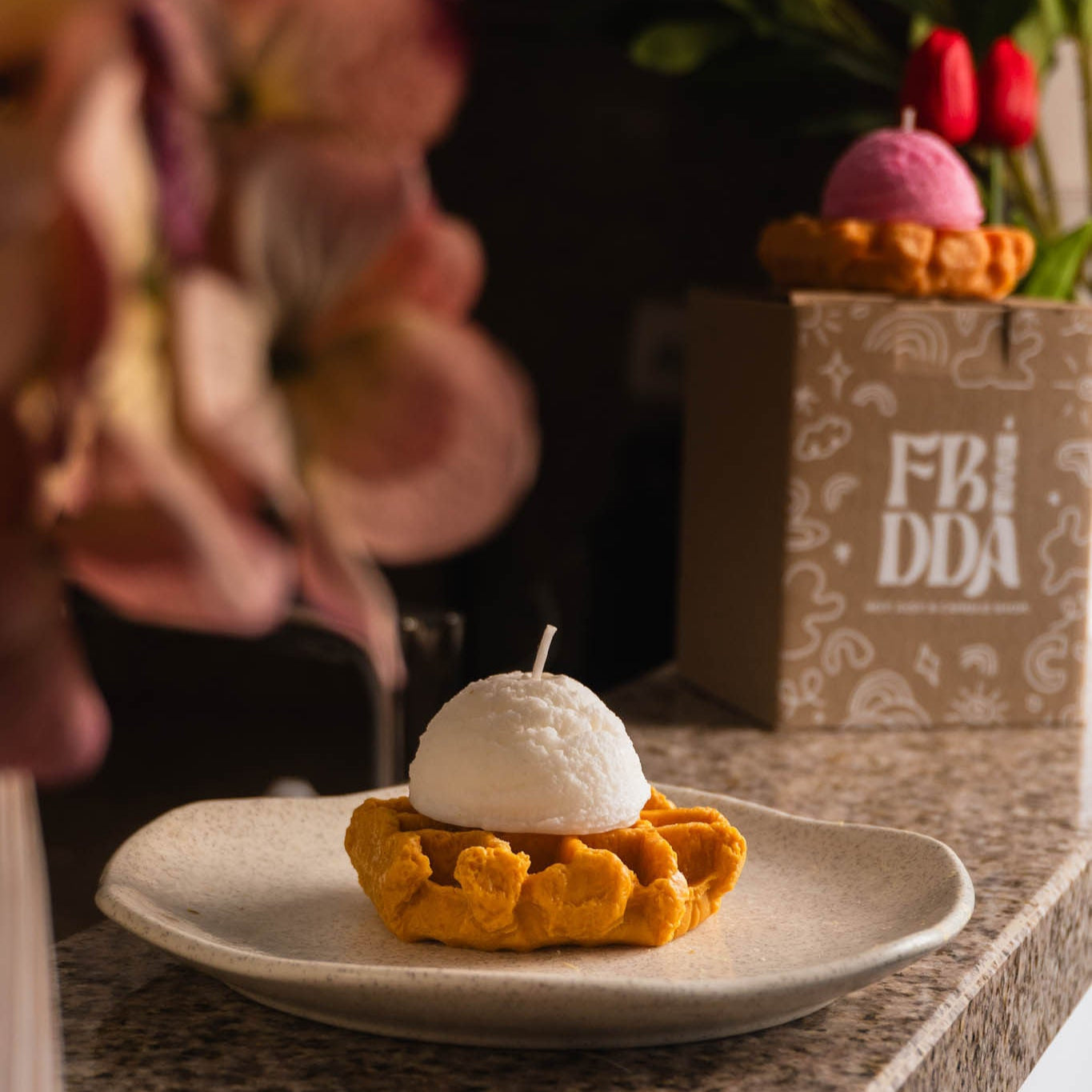 Vela artesanal que imita un waffle recién horneado con una bolita de helado cremoso. Cada pieza está elaborada a mano con 140 gramos de cera vegetal, perfecta para tener una decoración única e increíble —sí, todo lo que ves es cera.